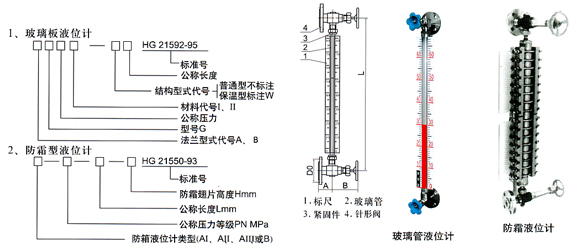 例2.壓力PN4.0Mpa、長度L=1260mm、翅片高度H=150mm、III類材料的A型防霜液面計,其標志為:防霜液面計AIII4.0-1260-150HG/T 21550-93